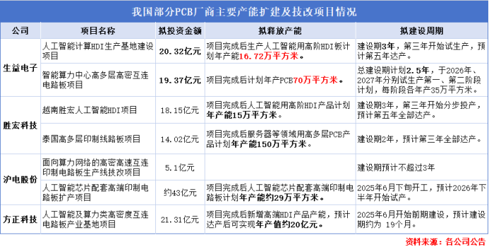 2025年11月17日,生益电子官宣定增预案,为人工智能计算HDI生产基地建设项目智能制造高多层算力电路板项目募资,两个项目总投资金额约为40亿元。待到项目全部达产后,前者预计将为公司带来16.72万平方米的PCB产能,后者则会带来70万平方米。