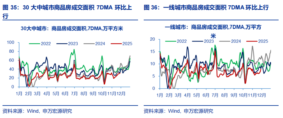 投资:建筑施工表现较弱,商品房市场季节性上行。本期水泥库容比周度环比下行 0.3pcts,水泥价格指数周度环比下行0.69%,水泥发运率周度环比持平上周。螺纹钢库存周度环比下行 3.8%,全国盈利钢厂比例周度环比下行2.6pcts,螺纹钢表观需求周度环比下行1.2%。总体来看,建筑施工终端需求表现较弱。本期30大中城市商品房成交面积 7DMA 周度环比上行8.3%。分能级来看,一线和二线商品房成交面积均上行,三线商品房成交面积下行。本期16城二手房成交面积7DMA周度环比下行1.7%;全国城市二手房出售挂牌价指数周度环比下行0.2%。本期百城成交土地面积上行,成交土地溢价率周度环比下行。出口:港口吞吐量延续下行,航运指数多数上行。本期港口货物吞吐量周度环比下行 0.6%,集装箱吞吐量周度环比上行5.4%。本期BDI指数周度环比上行12.53%,国内SCFI指数周度环比上行0.69%,CCFI指数周度环比下行0.09%。