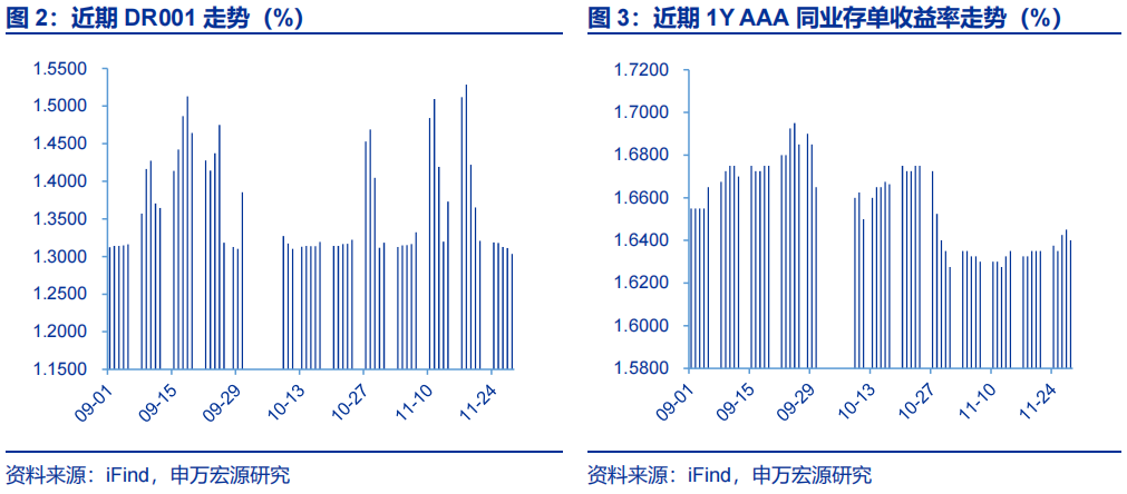 11月PMI显示我国基本面有所反弹,加速下滑态势有所缓解,但对于债市而言,近期可能更多受基金负债端扰动影响。现阶段做多债市仍受以下因素制约:1)《公开募集证券投资基金销售费用管理规定(征求意见稿)》未落地之前,市场观望心态浓厚,资金入场动力不足,2)进一步降息的可能性和预期也有所弱化,市场并未过多博弈,3)股债性价比的角度,债市的吸引力仍然不强,4)拉长维度来看,价格改善、股债再平衡等问题可能是主导明年债市的核心因素,市场对利空的敏感性和关注度更强,收益率中枢可能温和回升,配置盘提前在上年末抢跑的动力可能并不充分。综合来看,近期债市出现调整,对于配置盘而言可在收益率高点择机配置,对交易盘而言,虽然做多赔率有所抬升,但吸引力仍不强。
