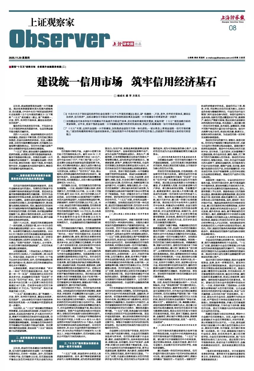 与此同时,从“十五五”规划建议的重要改革部署看,无论是推动科技创新、打造现代化产业体系,还是促进内需扩容、扩大高水平对外开放,都离不开完善的信用体系作为底层支撑。信用体系越健全,市场交易成本就越低,金融市场资源配置效率就越高。加快健全信用体系和信用市场建设不仅是提升市场运行效率、优化营商环境的现实需要,更是实现“十五五”规划战略目标的重要保障。