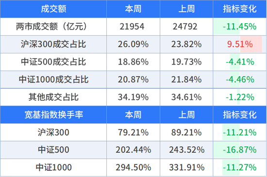成交额方面,两市成交额对比前周有所回落。成交结构上,沪深300成分股成交额占比周度均值较上周上升,中证500成分股、中证1000成分股、其他股票成交额占比周度均值较上周下降。