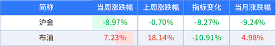 沪金周度下跌8.97%,原油周度上涨7.23%。