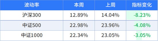 宽基指数波动率方面,沪深300指数、中证500指数、中证1000指数滚动20日波动率周度均值均较上周下降。沪深300最新滚动20日波动率低于过去三年以来平均水平,中证500指数、中证1000指数最新滚动20日波动率高于过去三年以来平均水平。