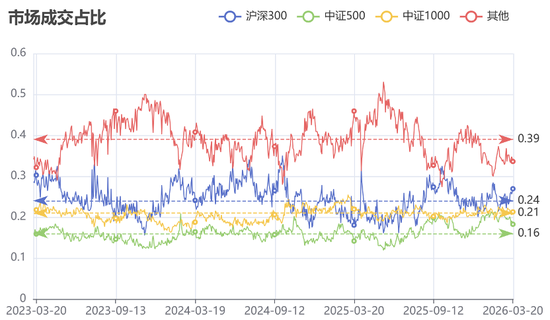 注释:指数成交占比计算方式:对应指数成分股成交额/两市成交总额;