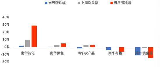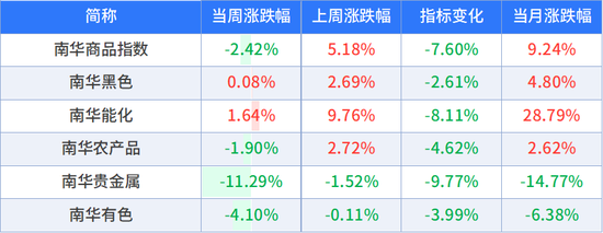 南华商品指数周度下跌2.42%。分板块看,周度上涨板块有:南华能化商品指数+1.64%、南华黑色商品指数+0.08%,周度下跌板块有:南华贵金属商品指数-11.29%、南华有色商品指数-4.10%、南华农产品商品指数-1.90%。