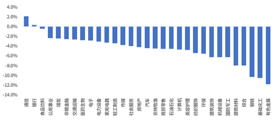 行业周度表现方面,申万一级行业中,通信、银行、食品饮料表现较好,涨跌幅分别为+2.10%、+0.36%、-0.48%。