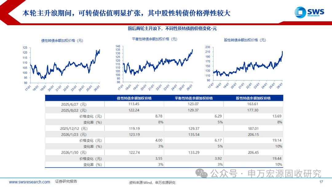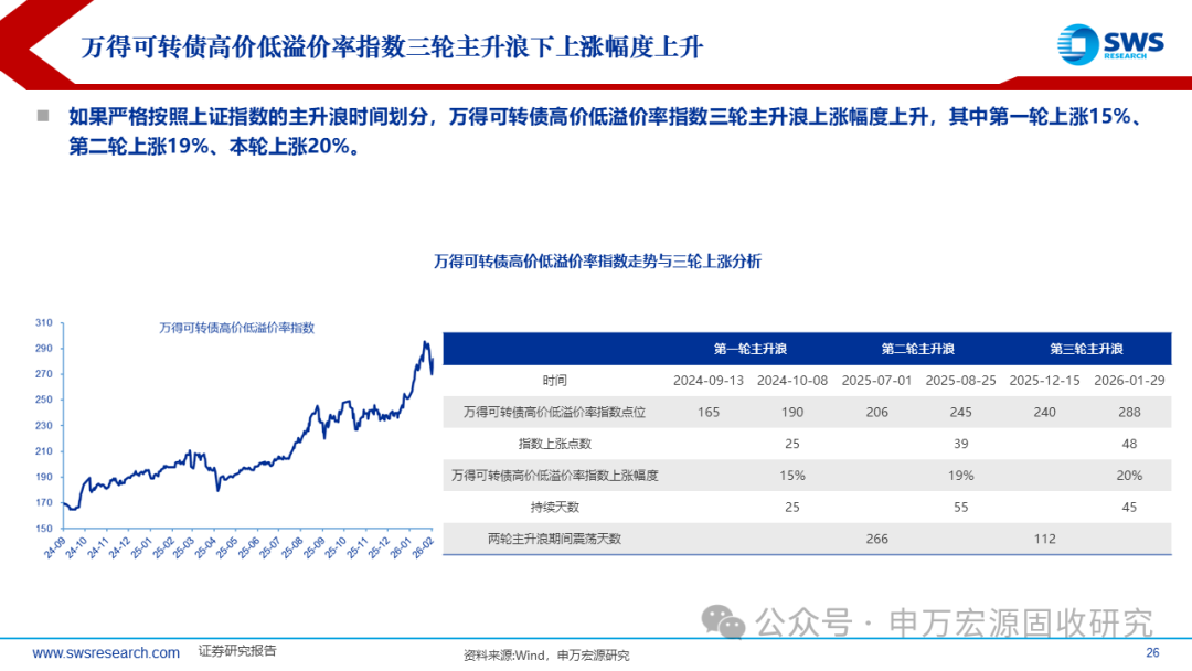 26年开年可转债行情估值驱动更加显著。本轮主升浪相对25Q3而言,转债指数上涨更快,同时涨的也更高;但是本轮主升浪期间,上证指数上涨幅度不及25Q3,同时万得可转债正股等权指数、正股加权指数本轮上涨幅度也落后于上一轮,这反映了本轮可转债行情估值驱动更加显著。