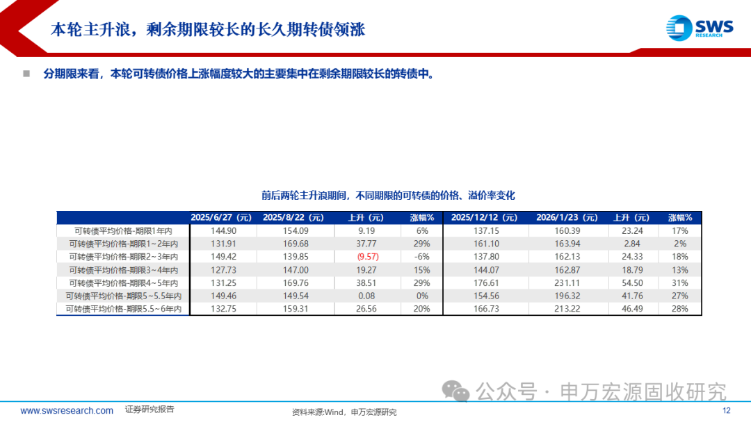股性转债的余额加权转股溢价率估值提升11.66%(25Q3期间提升6.30%),同时平价较高区间的估值提升的更加明显,比如平价在110~120、120~130、大于130的转债本轮余额加权转股溢价率分别提升15.64%、8.64%、6.22%相对25Q3主升浪期间提升3.00%、5.62%、5.73%显著扩大;与之类似的是,本轮长剩余期限的转债的估值普遍获得较大幅度提升,而上一轮主升浪期间不同期限的可转债的估值涨跌不一,不具有较强的一致预期性。在估值与正股驱动之下,可转债的价格弹性整体放大,具体来看,万得的高价低溢价率指数、高价指数、AA指数、小盘指数的上涨幅度均超过了上一轮主升浪期间的涨幅。