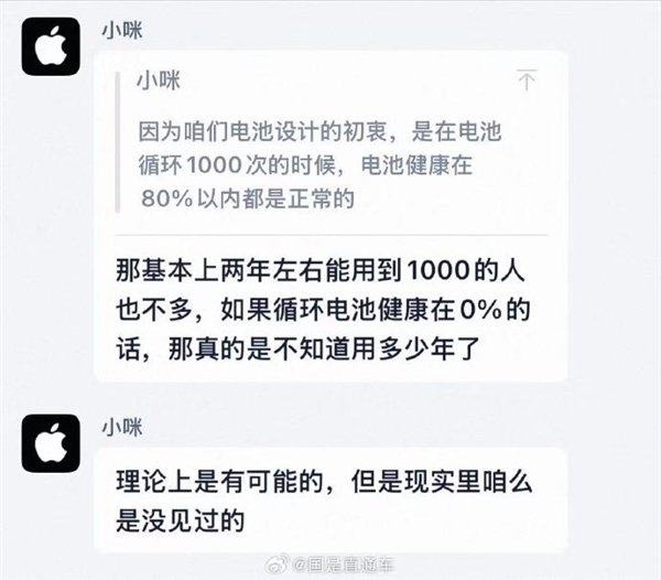 该客服补充称,基本上两年左右能用到1000的人也不多,如果循环电池健康在0%的话,那真的是不知道用多少年了。理论上是有可能的,但是现实里咱么是没见过的。
