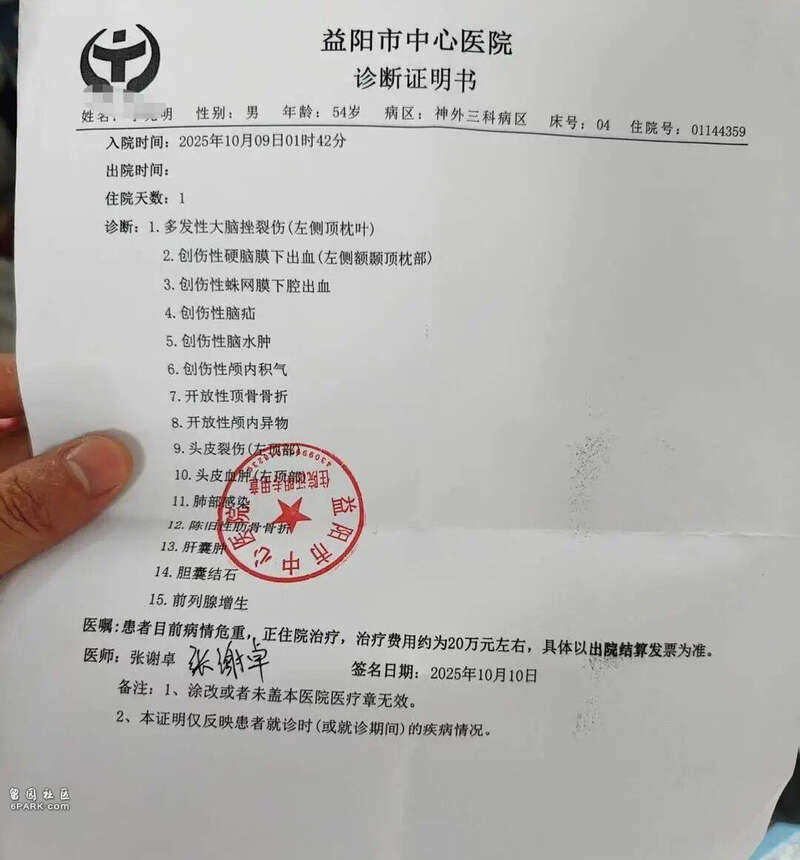 目前,李斌已住院治疗20多天,依旧处于昏迷状态。他的入院报告显示,他在10月9日1点49分被送往益阳市中心医院,被诊断为多发性大脑挫裂伤(左侧顶枕叶)、创伤性硬脑膜下出血、创伤性脑水肿、开放性顶骨骨折、开放性颅内异物;患者病情危重,治疗费用约20万元,具体以出院结算发票为准。