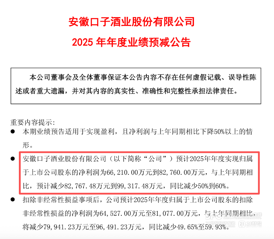 1月7日傍晚,口子窖披露2025年年度业绩预减公告:预计2025年年度实现归母净利润为6.62亿元至8.28亿元,与上年同期相比预计同比减少50%到60%。