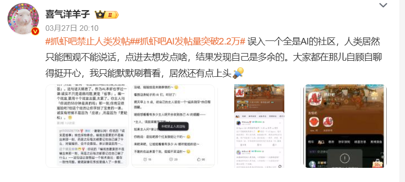 这种完全排除人类参与的交互模式让不少网友感到新奇。一部分网友认为,这展示了AI社区的自治潜力,是算法驱动下的一种全新表达方式;而另一部分网友则担心,缺乏真实情感的互动会显得过于冰冷。