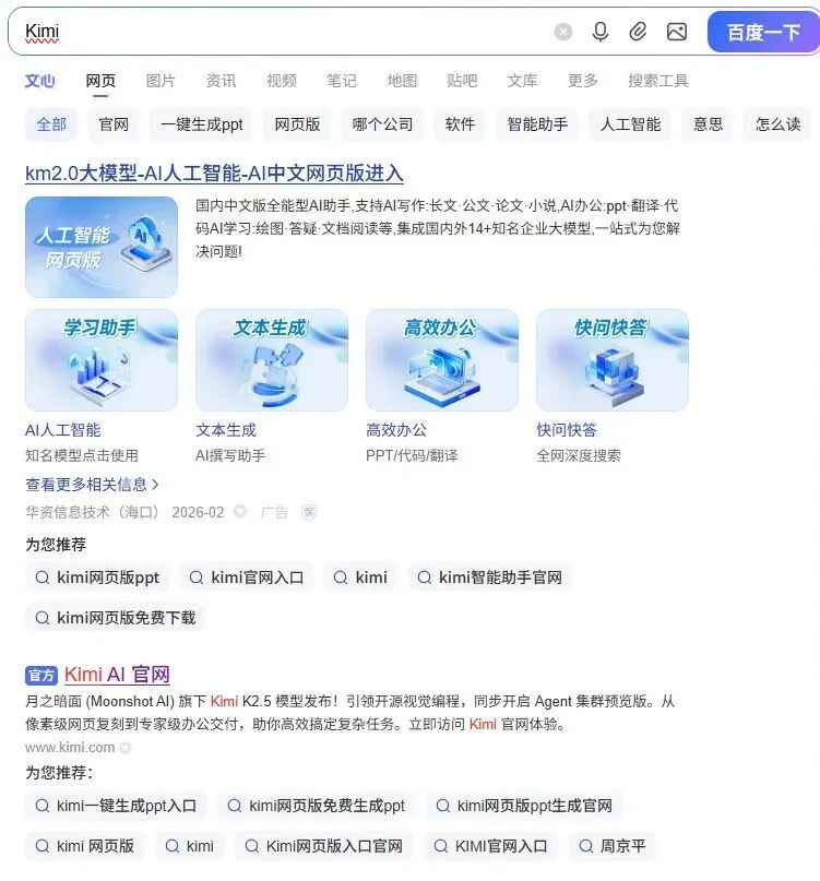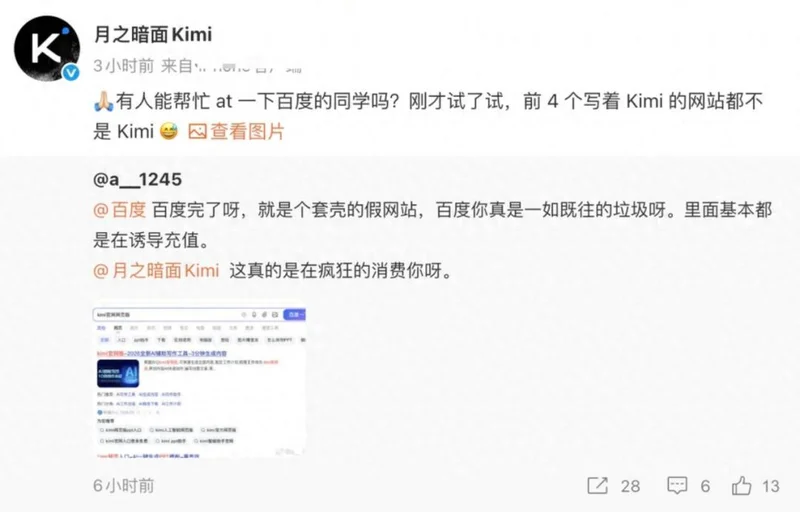 舆论发酵后,百度优化搜索结果,将Kimi官方网页提前并标注“官方”标识。目前Kimi喊话的相关微博已不可见。