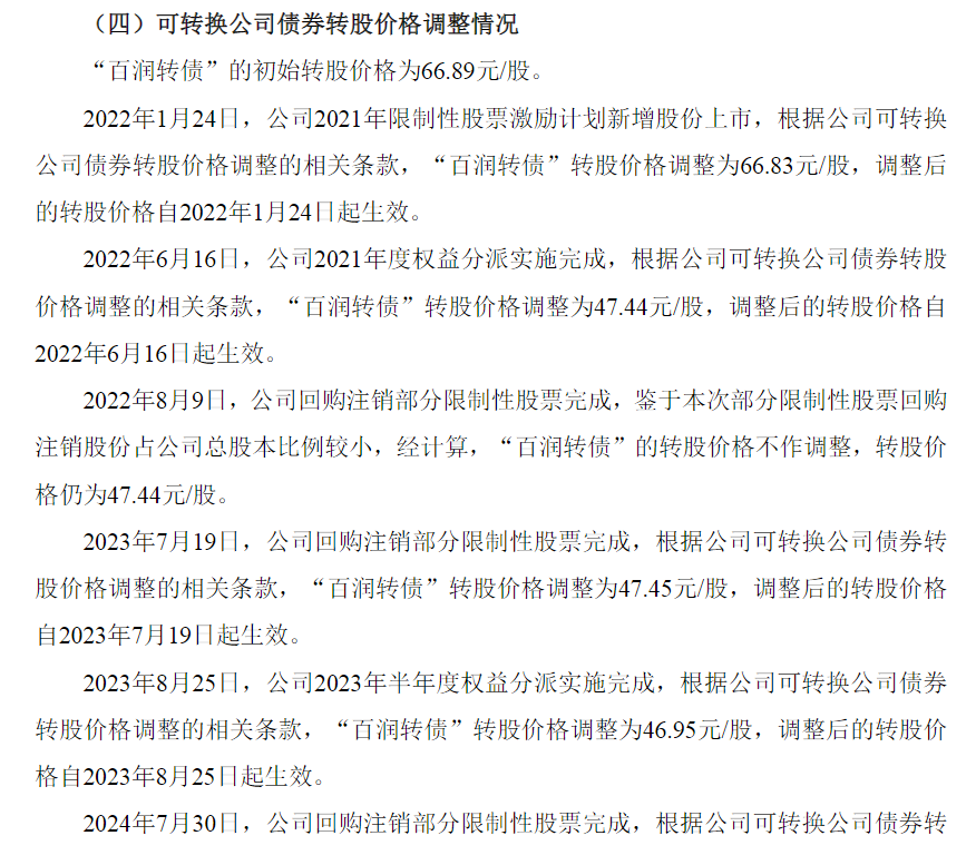 2025年6月5日,公司2024年度权益分派实施完成,根据公司可转换公司债券转股价格调整的相关条款,“百润转债”转股价格调整为46.66元/股,调整后的转股价格自2025年6月5日起生效。