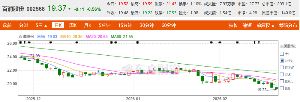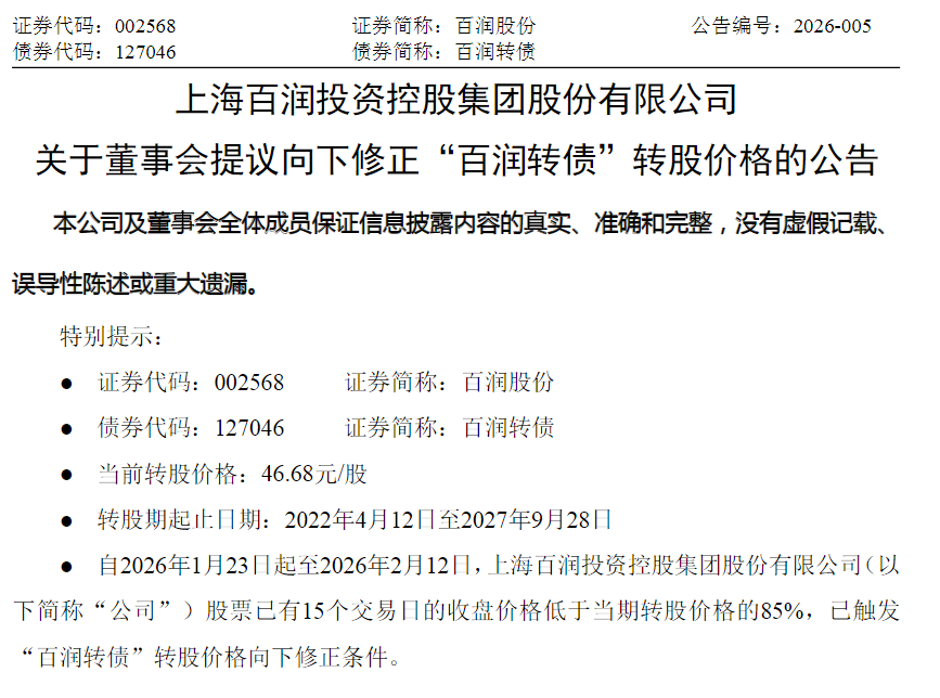 截至2026年2月,百润股份的股价已经跌至20元区间,较之前46.68元的原转股价出现了大幅折价。