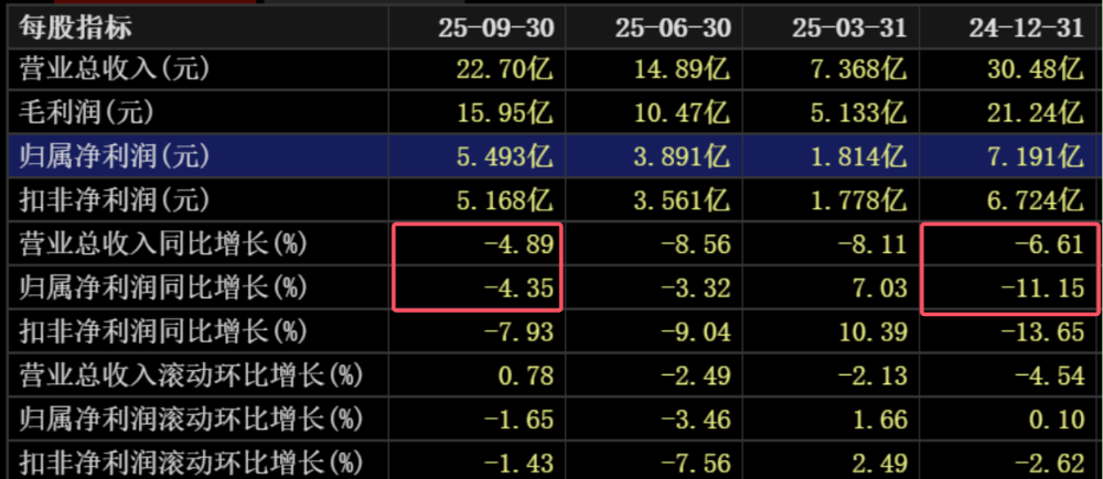 2024年百润股份营业收入下滑6.61%,归母净利润下滑11.15%;2025年前三季度营业收入继续下滑4.89%,归母净利润下滑 4.35%。