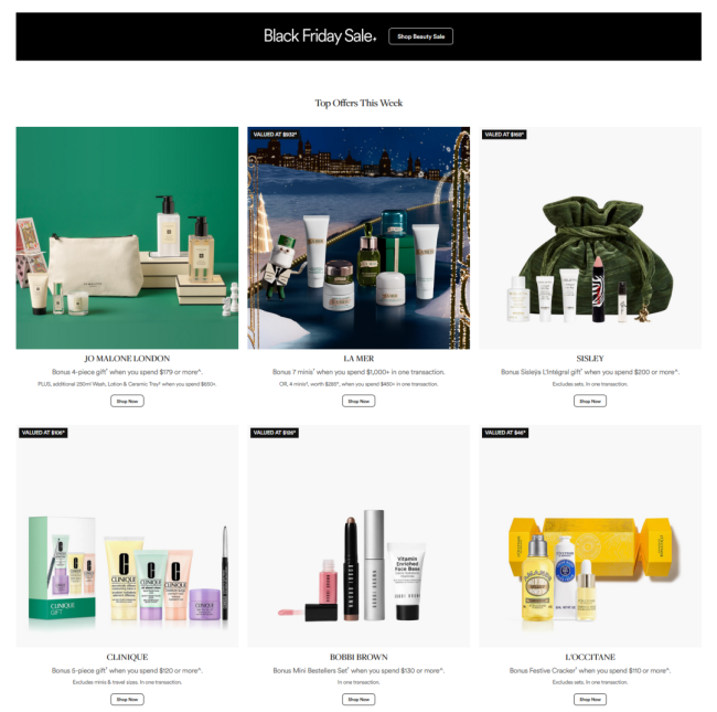 【1】黑五美妆护肤品大特卖,以及叠加买满送礼包活动。