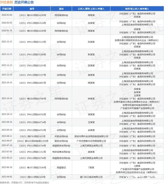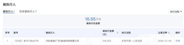 据天眼查APP,2026年1月6日,东莞市第一人民法院要求被执行人沙拉食刻食品科技有限公司履行义务,被执行总金额为10.55万元。此外,2025年12月24日,深圳市福田区人民法院将深圳厨易时代食品科技有限公司列为被执行人,被执行总金额为1.69万元。