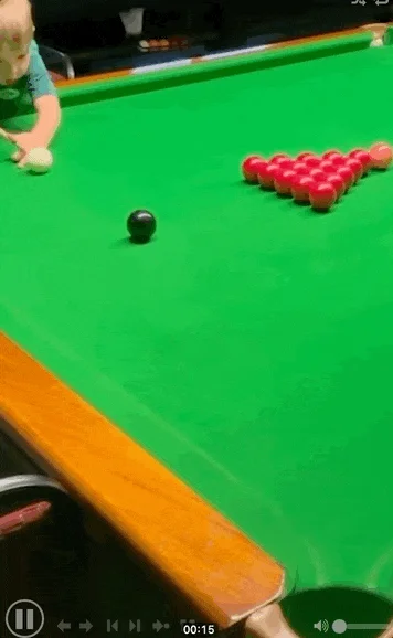 画面很诡异,孩子甚至没斯诺克球台高,只能爬凳子上玩;结果他手上功夫甚至要令不少成年人汗颜。