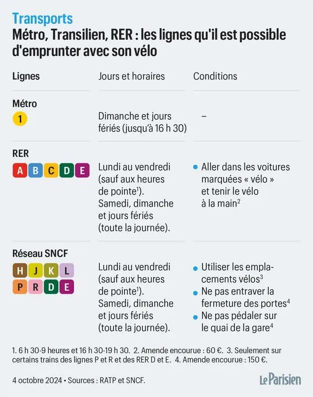 而普通自行车在工作日非高峰时段 + 周末/节假日全天,放置到指定自行车区域,并且全程看管好的情况下,可以带进RER和Transilien线路。