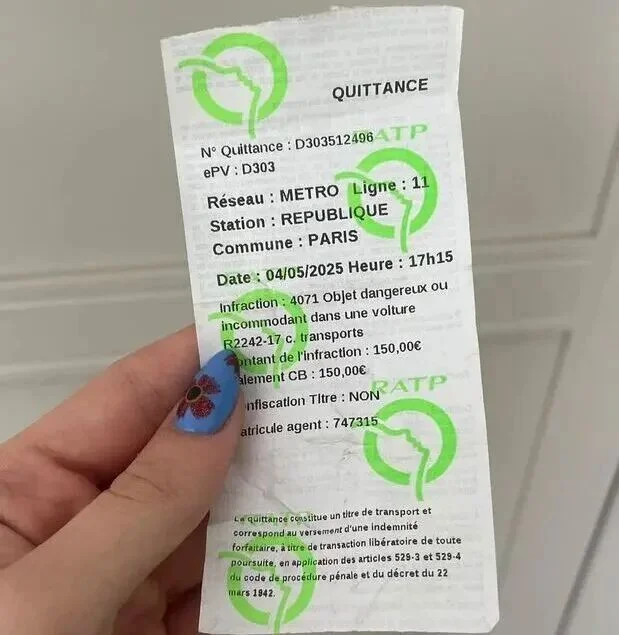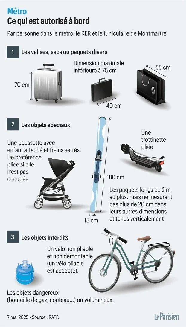 这背后对应的是法国《交通法典》的原则:只要你携带或运输的物品因为性质、数量或包装不足,可能“危险、妨碍或使旅客不适”,就可能被禁止进入公共交通工具。