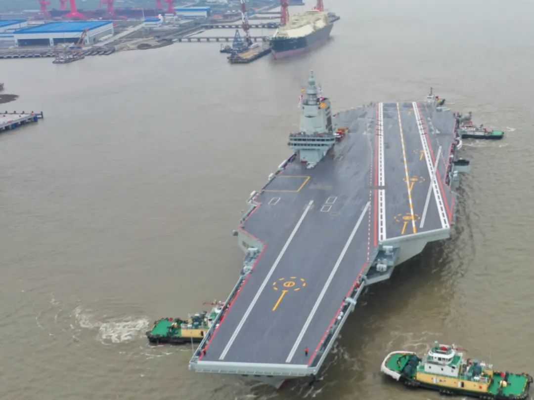 2024年5月1日8时许,我国第三艘航空母舰福建舰从上海江南造船厂码头解缆启航,赴相关海域开展首次航行试验。这是拖船正在将福建舰拖离码头(无人机照片)。新华社发(蒲海洋摄)