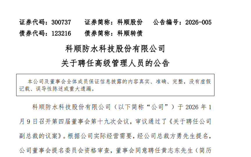 同时,根据科顺股份实际经营需要,经公司总裁方勇先生提名,公司董事会提名委员会资格审查,董事会同意聘任黄志东担任公司副总裁。