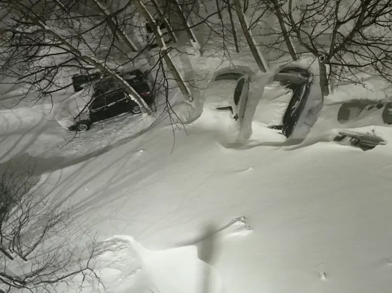 现场画面显示,车辆几乎完全被厚厚的积雪吞没,四驱车在雪地中艰难行驶以寻找抓地力,部分道路则被巨大的雪堆彻底阻断。许多居民不得不铲出临时通道,才能进出公寓楼。