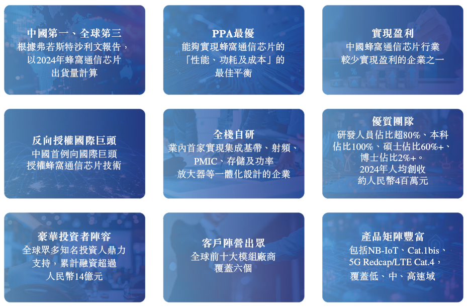 根据弗若斯特沙利文报告,于2024年按出货量计,移芯通信在蜂窝通信芯片行业位于中国第一, 全球第三;公司的NB-IoT产品亦稳居全球第一,Cat.1bis产品位居全球第二。