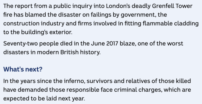 由退休法官马丁·摩尔比克(Martin Moore-Bick)领导的公开调查历时多年,前期报告专注火灾当晚情形,而最终报告则全面检视系统性问题。