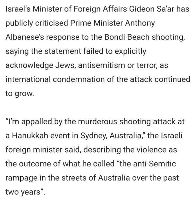 “我对在澳大利亚悉尼举行的光明节活动上发生的致命枪击感到震惊”,以色列外交部长说,并将这起暴力事件描述为他所谓的“过去两年在澳大利亚街头发生的反犹太主义暴行”的结果.