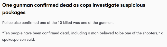 警方发言人表示:“已有十人确认死亡,其中包括一名被认为是枪手的男子。另一名枪手情况危急。”