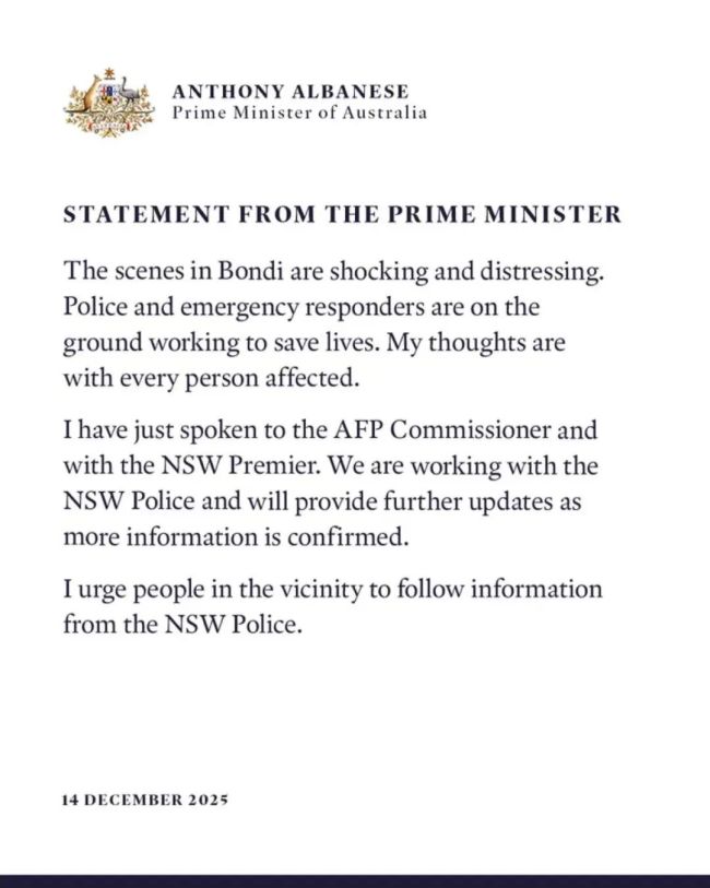“Bondi海滩的现场令人震惊和悲痛。警察和应急响应人员正在一线工作以拯救生命。我与所有受影响的人同在。
