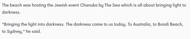 现场自称犹太牧师兼急救人员Vladimir Kotlyar说:“将光明带入黑暗。黑暗今天降临了我们。去澳大利亚,去Bondi海滩,去悉尼。”