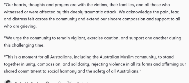“这是所有澳大利亚人,包括澳大利亚穆斯林社区,团结一致、同情与团结的时刻,拒绝一切形式的暴力,重申我们对社会和谐和全体澳大利亚人安全的共同承诺。”