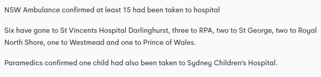 其中6人被送往达令赫斯特的圣文森特医院,3人前往RPA,2人前往圣乔治医院,2人前往皇家北岸医院,1人前往韦斯特米德医院,1人前往威尔士亲王医院。