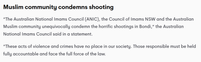 “The Australian National Imams Council (ANIC)、UNSW Imams Council以及澳大利亚穆斯林社区明确谴责邦迪发生的可怕枪击事件。”