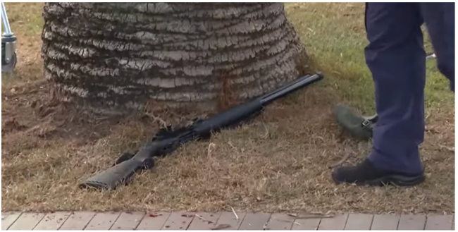 现场画面显示,地上有一把看起来像是泵动式霰弹枪,旁边还有一顶棒球帽,一名警员站在附近。