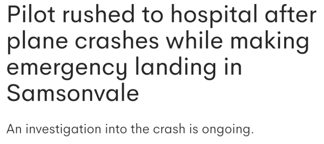今天上午,一架轻型飞机在萨姆森维尔北派恩水坝附近紧急降落时发生坠机事故,飞行员随即被紧急送往医院救治。事故原因正在调查中。