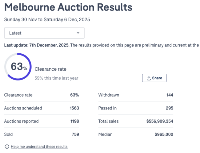 成交759套,清盘率为63%,成交价格中位数96.5万澳元。