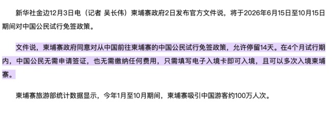 当地时间 12 月 2 日,柬埔寨王国政府正式宣布,将在 2026 年 6 月 15 日至 10 月 15 日 期间,为中国公民实施免签入境的试点政策。