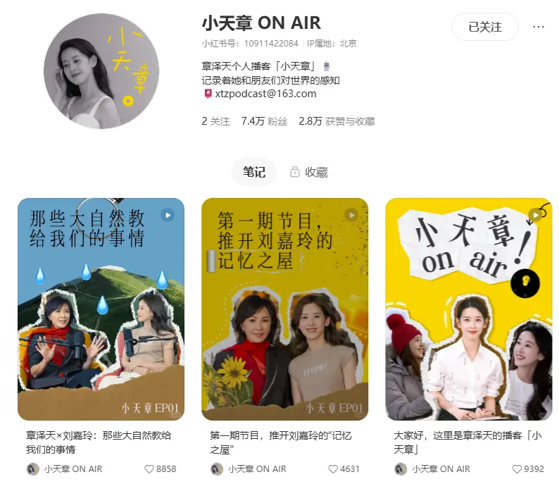 章泽天播客预告首期嘉宾 小红书账号粉丝已超7万 Source 1月12日,章泽天在“小宇宙”平台开通个人播客,取名“小天章”。同时也在小红书开设了账号“小天章ON AIR”,并公布第一期播客的嘉宾为刘嘉玲。截至发稿,章泽天小红书账号粉丝数已达到7.4万。 目前,首期节目的先导片已放出,对话嘉宾是TVB著名女演员刘嘉玲。节目中,章泽天来到了刘嘉玲的家中录制。刘嘉玲表示:“那个时候自己住在18楼,9楼是张国荣住的”。 据介绍,第一期《刘嘉玲说,60岁是她的黄金时代》完整版将于1月13日下午2:00上线。