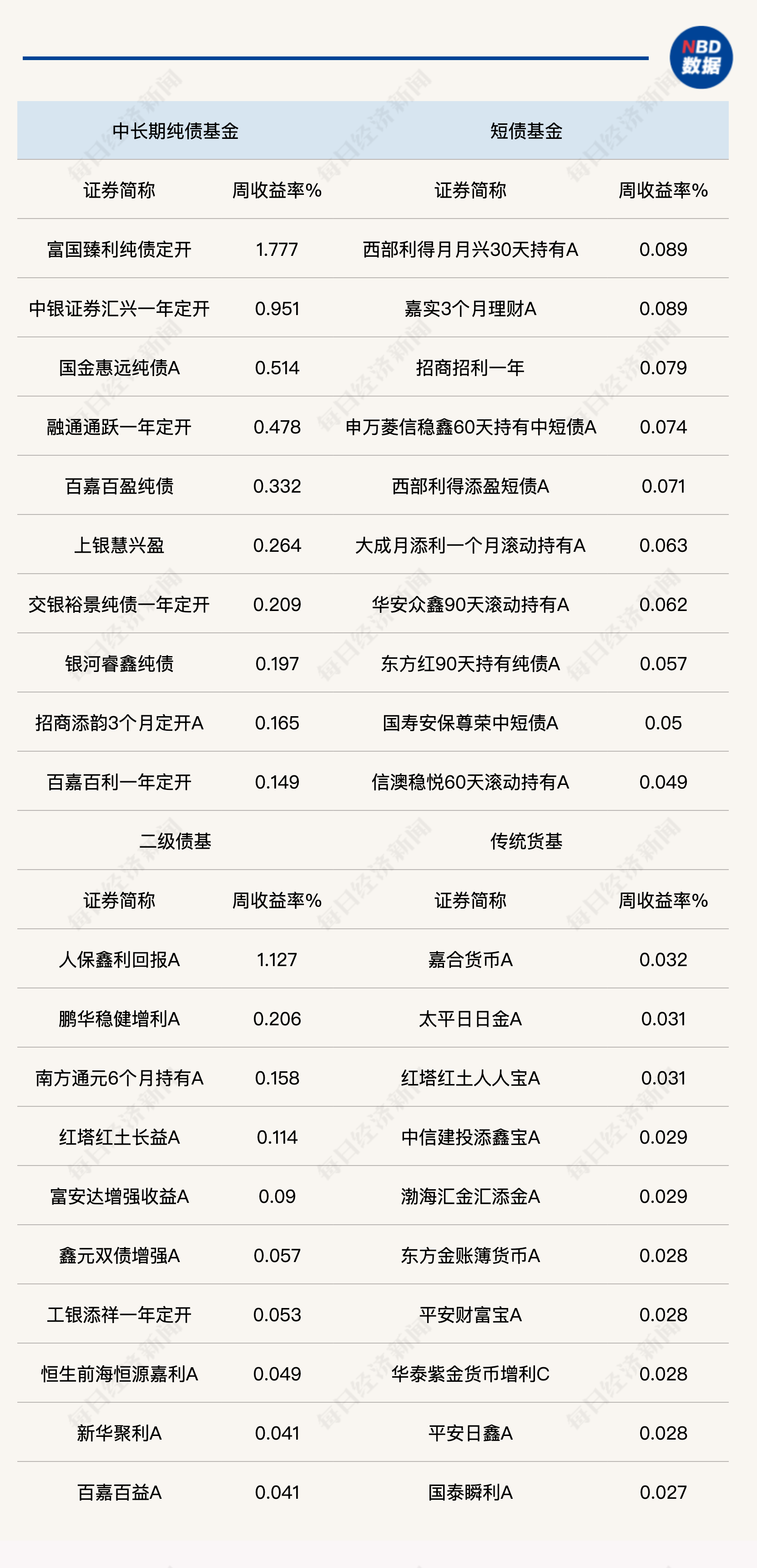 这一点从纯债基金的收益率上就能看出。Wind统计显示,上周中长期纯债基金的平均收益率为0.02%,短债基金也为0.02%,对比此前一周来看均有所降低。头部产品业绩中,富国臻利纯债定开的周收益率达到1.78%,人保鑫利回报达到1.13%,其余产品则全部在1%以下。