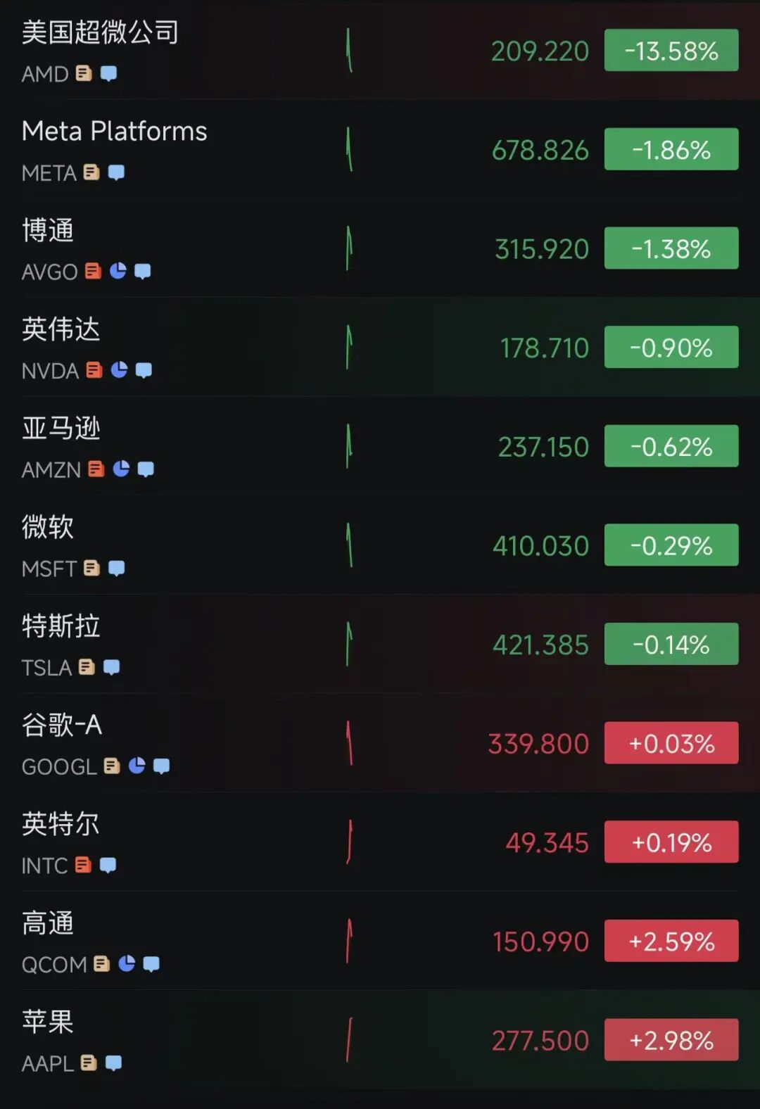 美股科技股多数下跌,AMD跌超13%,因其第一季度业绩指引不及部分分析师预期。Meta跌超1.86%,英伟达跌0.9%,亚马逊跌0.62%,微软跌0.29%,特斯拉跌0.14%,谷歌-A涨0.03%,英特尔涨0.19%,高通涨2.59%,苹果涨2.98%。