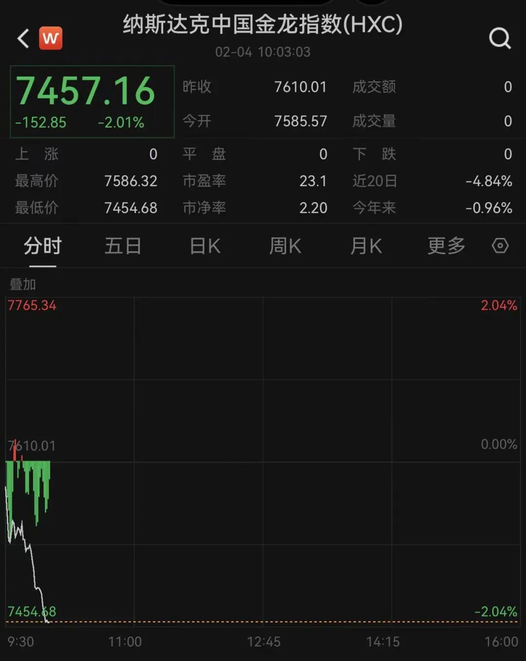 纳斯达克中国金龙指数跌超2%,最新报7457.16点。