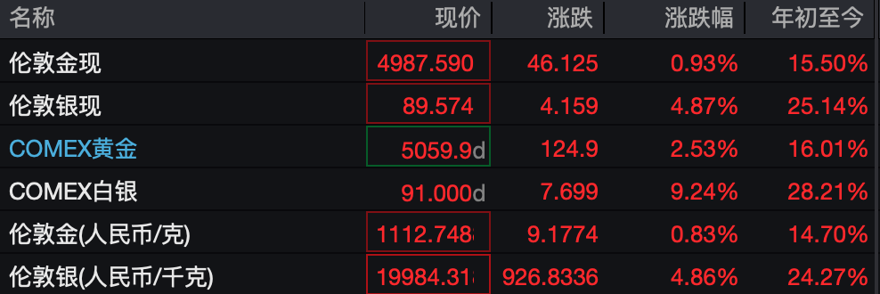 贵金属方面,2月4日,现货黄金涨0.93%,报4987.59美元;现货白银涨超4.1%,盘中一度重回90美元/盎司,报89.57美元/盎司。