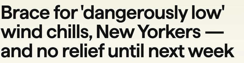 根据国家气象局的消息,一股北极锋面将把刺骨冷空气带入纽约都会区,周五夜间至周末期间将出现“危险低温”的风寒效应。
