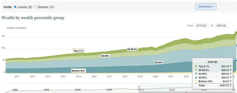 顶层1%家庭掌控32.3%的社会财富,87%的高收入家庭通过资本市场获利;而中低收入群体工资涨幅(1.4%-2.3%)远低于通胀率(2.7%),实际购买力持续萎缩,家庭债务总额攀升至18.59万亿美元,信用卡平均年化利率高达22.25%,多数人靠借贷维持生计,毫无风险缓冲能力。