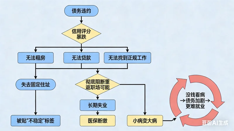 债务违约会导致信用评分暴跌,进而无法租房、贷款、找到正规工作;失去固定住址后,“不稳定”标签会彻底阻断重返职场的可能;长期失业又会导致医保断缴,小病变大病,最终陷入“没钱看病→债务加剧→更难就业”的死循环。