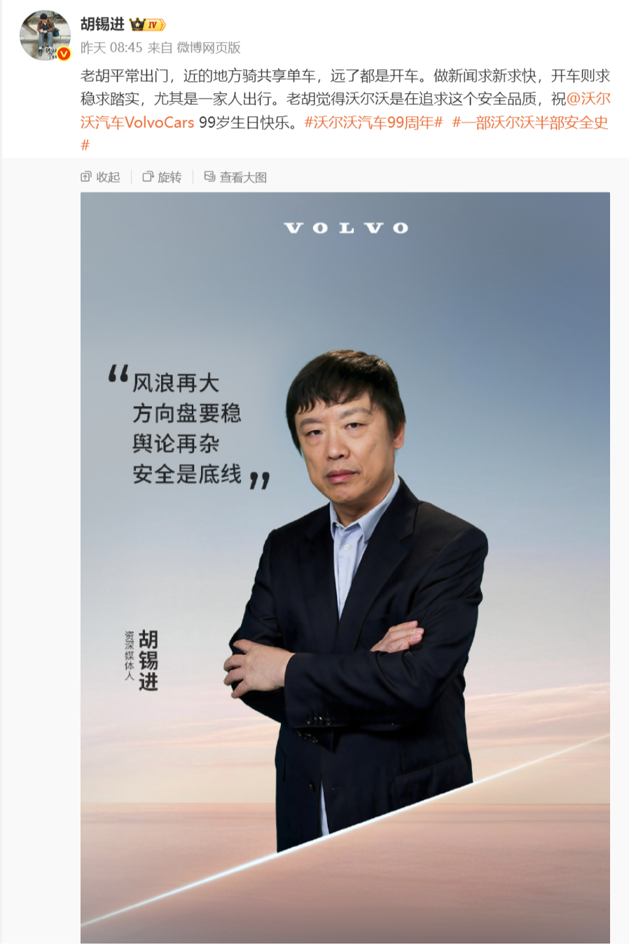 他觉得沃尔沃是在追求安全品质,并祝沃尔沃汽车99岁生日快乐。